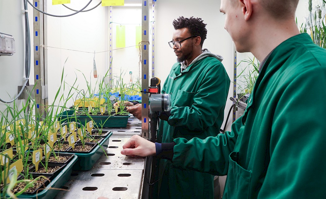 Pictured above: Wild Bioscience crop facility coordinator Isaac Adegboye and technician Max Finlay carrying out plant care checks at Milton Park.